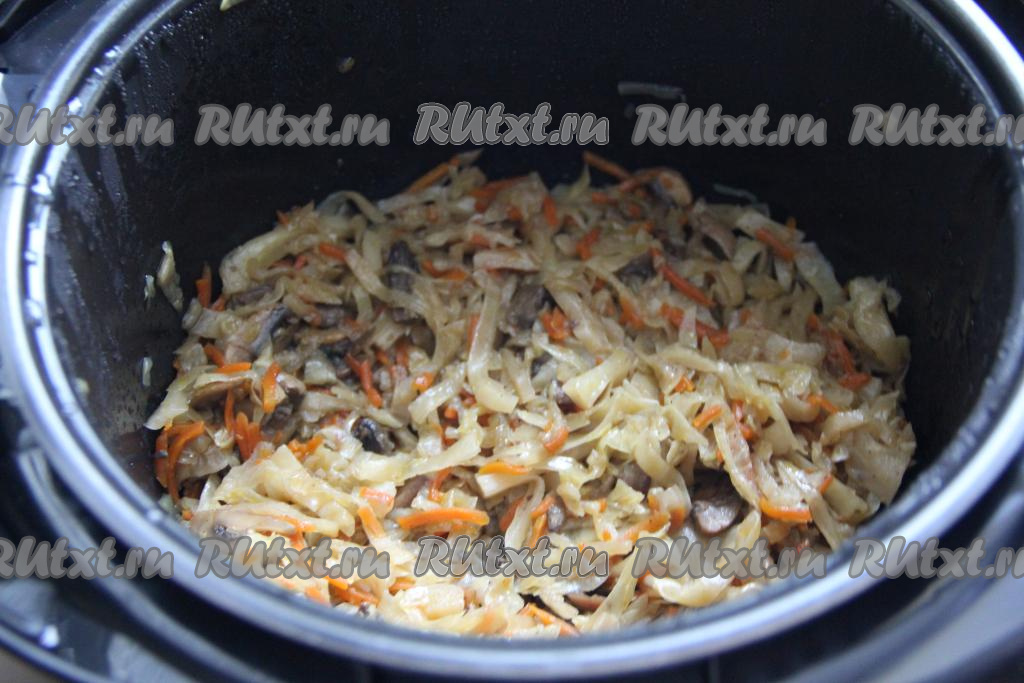 Перемешать капусту с шампиньонами, закрыть крышку мультиварки и установить режим "Тушение" на 1 час. В процессе тушения откройте крышку мультиварки, если капуста суховата, можно добавить несколько столовых ложек воды, а затем закрыть крышку мультиварки и продолжать готовить до сигнала. Я воду не добавляла. После звукового сигнала блюдо будет полностью готово.