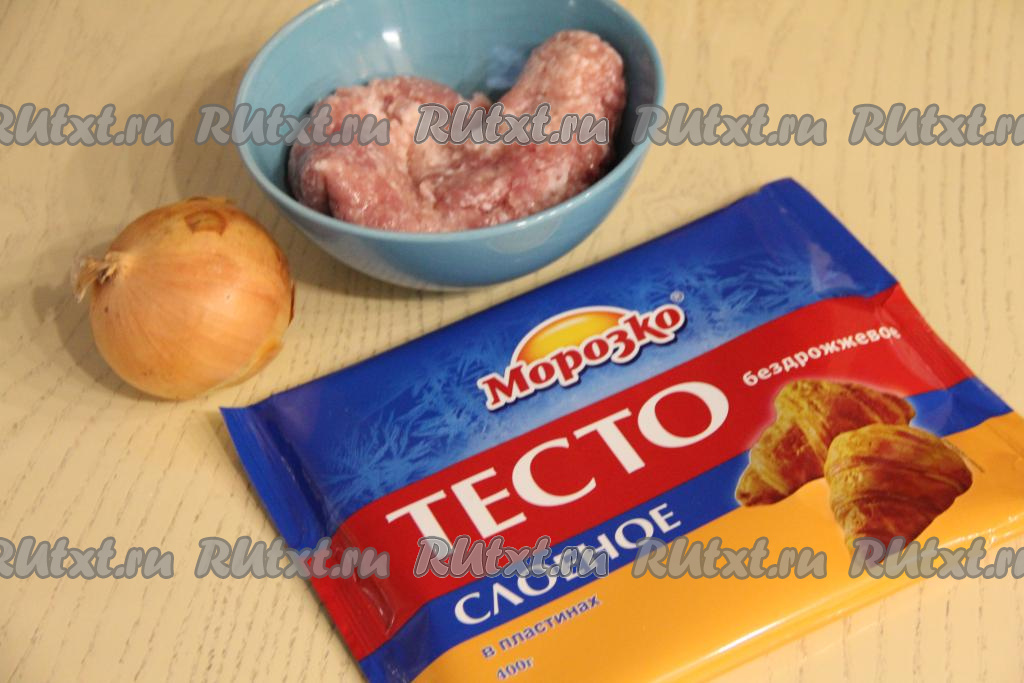 Подготовить продукты. Слоёное тесто (подойдёт как дрожжевое, так и бездрожжевое) нужно заранее достать из морозилки и разморозить при комнатной температуре.