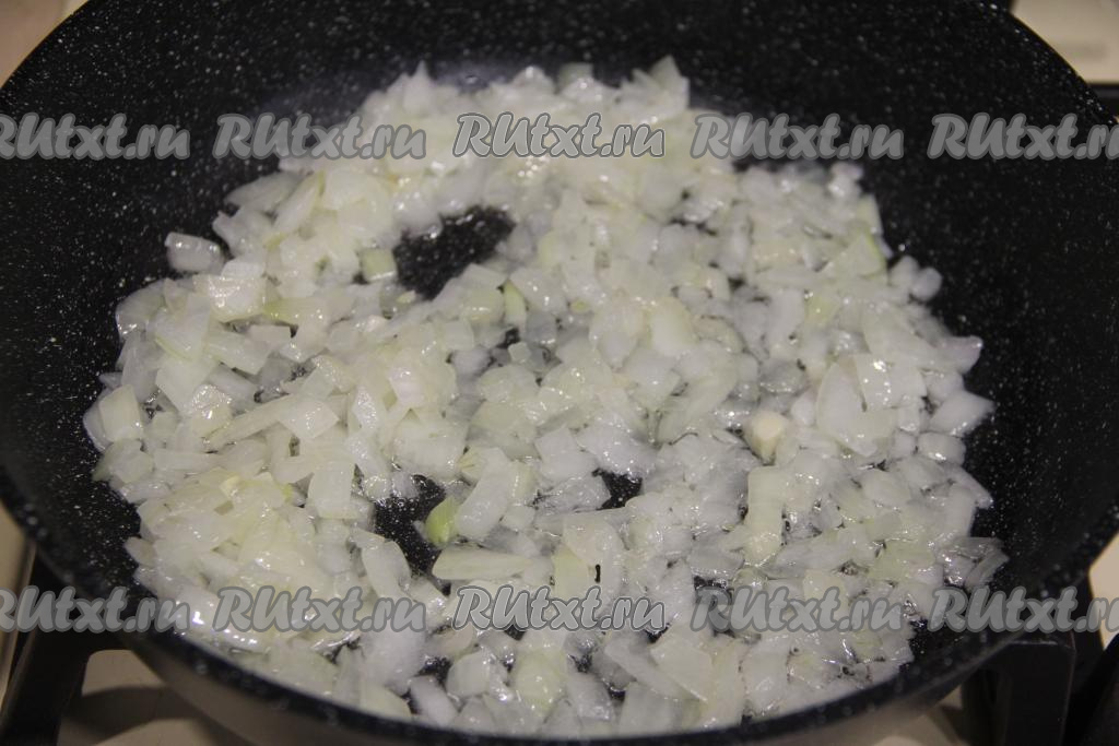 В сковороду влить растительное масло, разогреть, после этого выложить мелко нарезанный лук и обжарить его на среднем огне до прозрачности (в течение 4-5 минут), иногда помешивая.