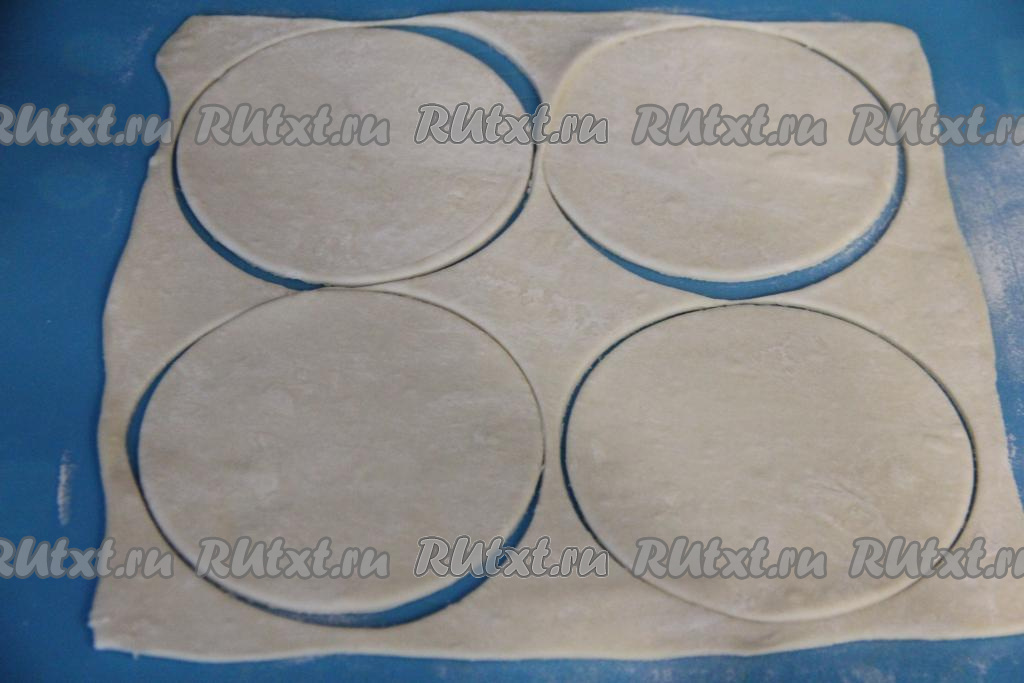 У меня тесто было в 2 пластах. Вначале первый размороженный пласт слоёного теста выложить на припылённую мукой поверхность.