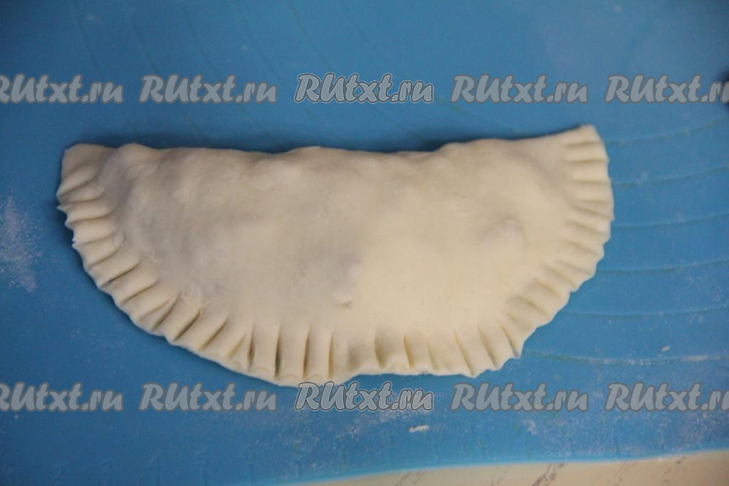 Накрыть начинку чистым краем кружка, формируя чебурек. Края теста прижать вилкой, сделав аккуратный край чебурека. Аналогично сформировать оставшиеся заготовки чебуреков.