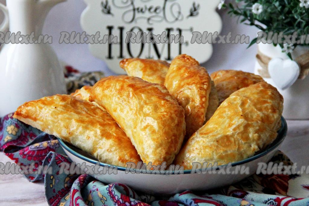 Очень вкусные чебуреки, покрытые тонким, хрустящим слоёным тестом снаружи, и сочные внутри достать из духовки и можно сразу подавать их к столу.