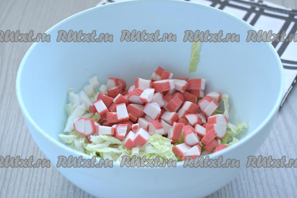 Крабовые палочки, если они заморожены, нужно полностью разморозить. Затем крабовые палочки нарезаем на небольшие кубики, добавляем к капусте.