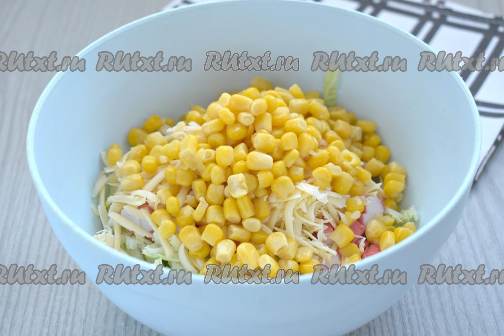 С консервированной кукурузы сначала сливаем жидкость, а затем тоже добавляем в миску с салатом из крабовых палочек, пекинской капусты и сыра.