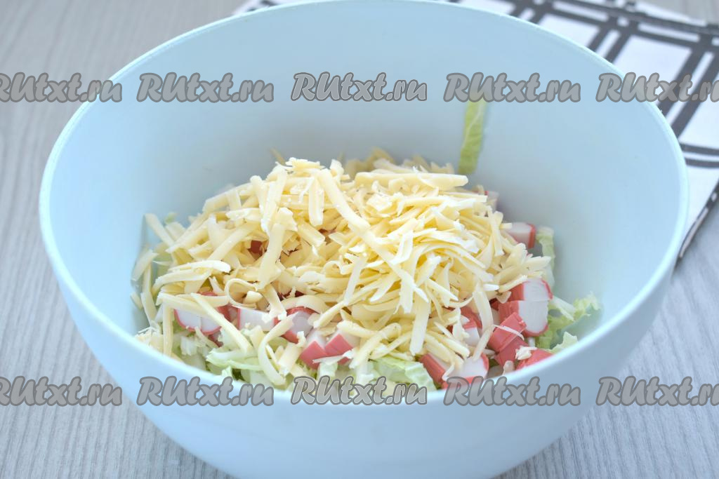 Сюда же выкладываем сыр, натёртый на крупной тёрке.