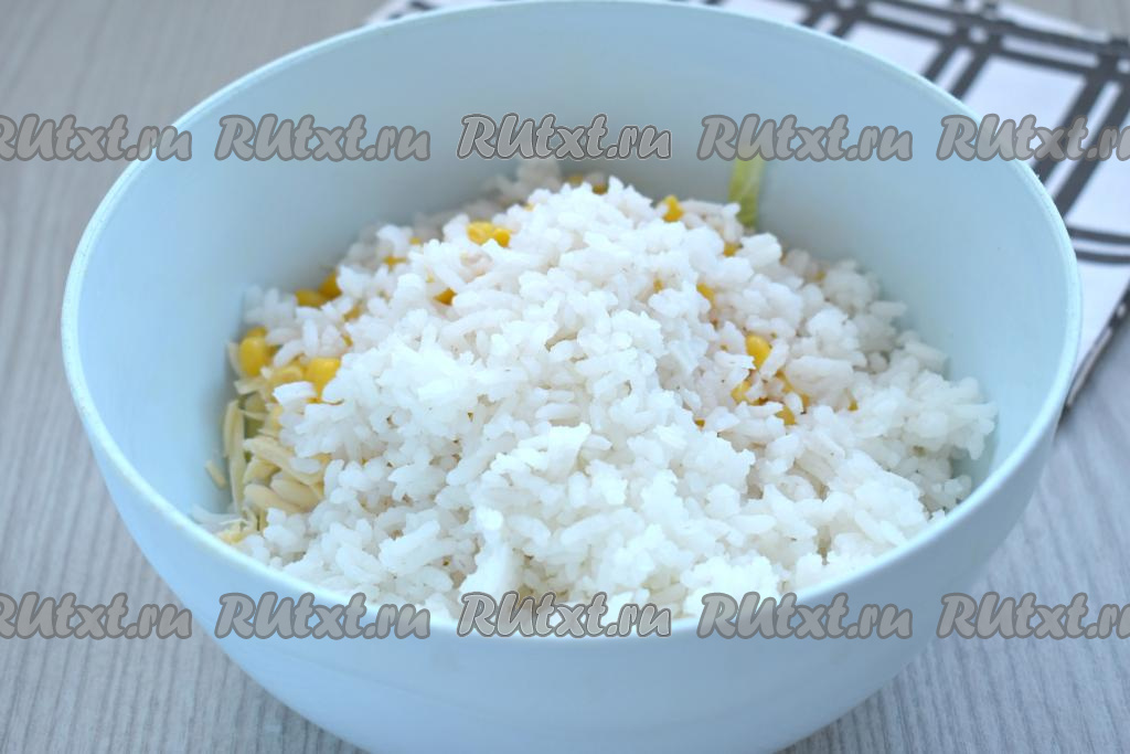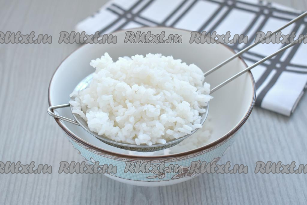 Промываем рис под проточной водой, выкладываем в кастрюлю с достаточно большим количеством кипящей подсоленной воды, перемешиваем, даём ещё раз воде закипеть. Варим на небольшом огне до готовности риса (минут 20, рисинки должны стать достаточно мягкими, но не переваренными). Откидываем сваренный рис на сито, ополаскиваем холодной водой, даём воде полностью стечь.