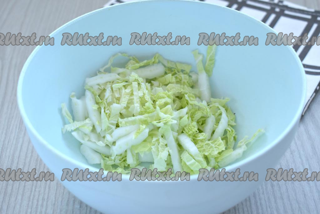 Пекинскую капусту промываем водой, немного обсушиваем. Нарезаем пекинскую капусту на достаточно тонкие полоски, перекладываем в объёмную миску.