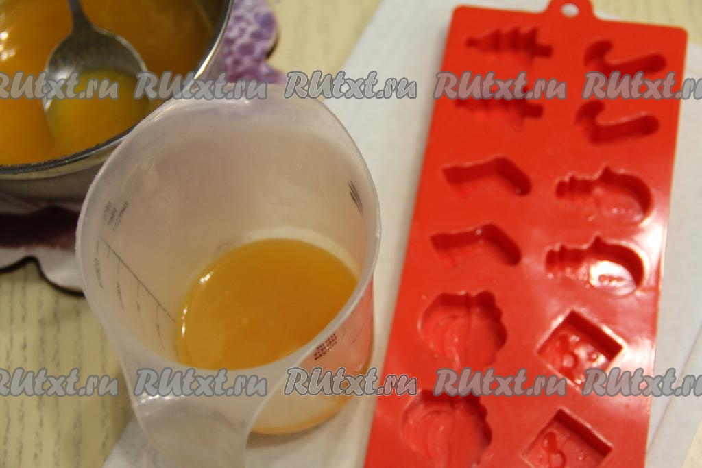 Для того чтобы получившуюся смесь было удобно разливать по формочкам, перелить горячую мандариновую смесь в мерный стакан с носиком.