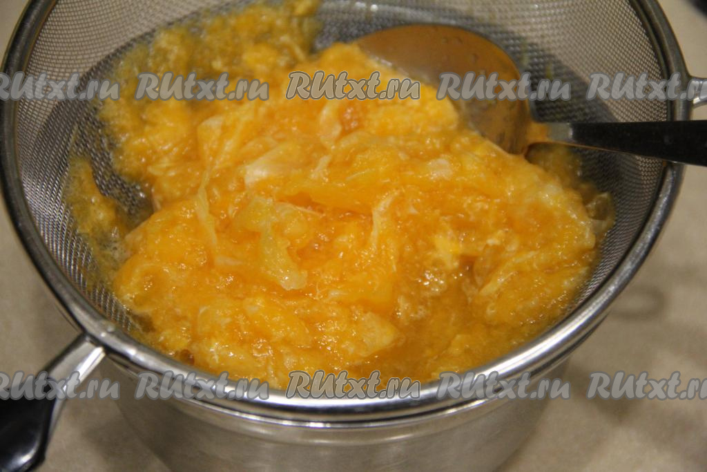 Измельчить мандарины в пюре. Взять сито, поставить его поверх небольшой ёмкости. Получившуюся мандариновую массу переложить в сито и перетереть столовой ложкой в ёмкость, которая находится под ситом. В результате в сите останется практически сухой жмых (он нам не понадобится), а в ёмкости, находящейся под ситом, будет мандариновый сок.