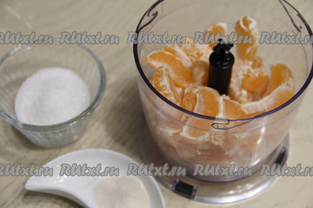 Мандарины очистить от кожуры, разделить на дольки, удалить косточки, если они есть. Выложить дольки мандаринов в чашу блендера или измельчителя.
