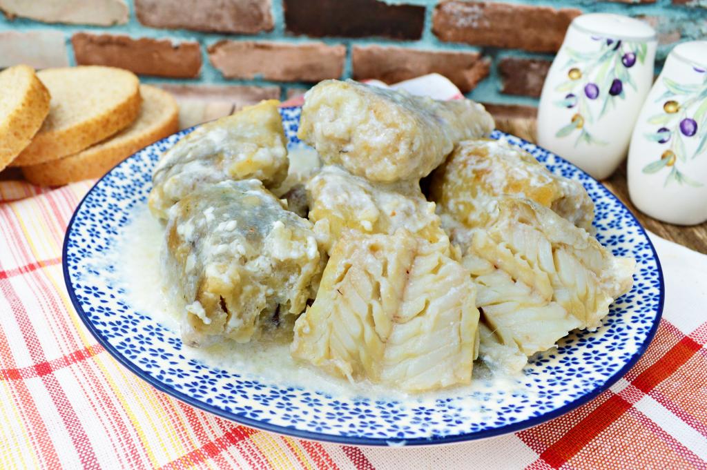 Вкуснейшего, сочного минтая, тушёного в сметане, разложить со сковороды по тарелкам и в горячем виде подать к столу. Такую рыбку можно дополнить различными гарнирами. Я предпочитаю подавать минтая с картофельным пюре, поливая сметанным соусом, в котором он тушился.