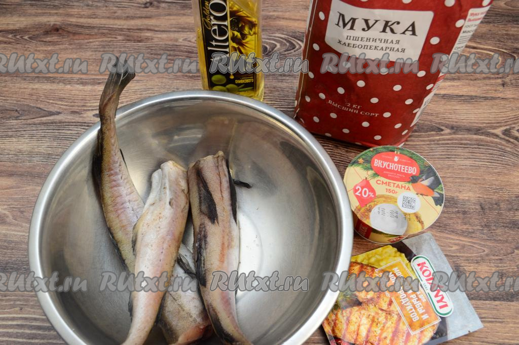 Подготовить продукты. Тушки минтая заранее разморозить. Сметану можно взять любой жирности.