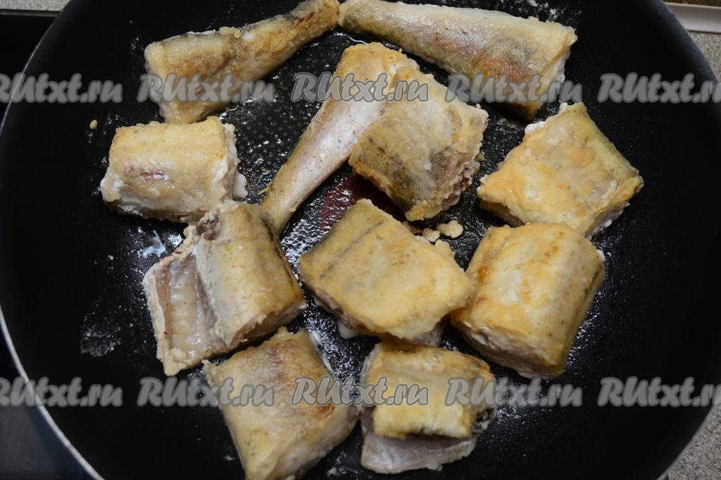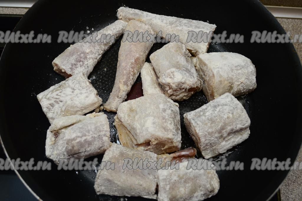 Сковороду хорошо разогреть с растительным маслом, затем выложить в один слой подготовленные кусочки минтая.