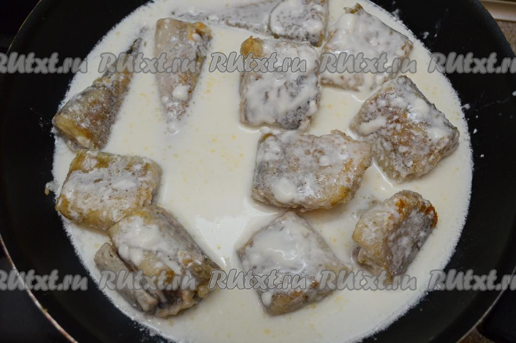 Обжарить рыбу с двух сторон до золотистого цвета (примерно по 3 минуты с каждой стороны) на среднем огне. До готовности доводить минтая не надо, он ещё будет тушиться в сметане.