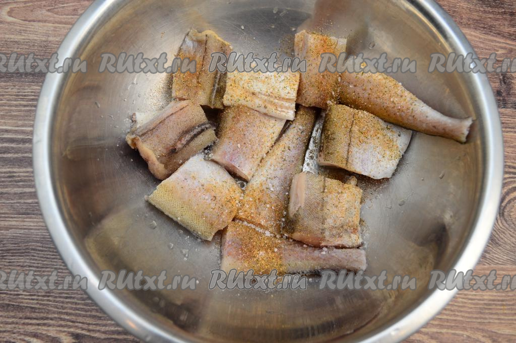 Посолить кусочки минтая, посыпать специями (я использовала чуть меньше чайной ложки специй для рыбы).
