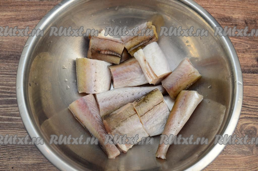 У тушек минтая отрезать хвосты, плавники. Разрезать брюшки рыбы, удалить внутренности вместе с чёрной плёночкой. Хорошо промыть рыбку проточной водой, обсушить. Нарезать минтая на порционные кусочки.