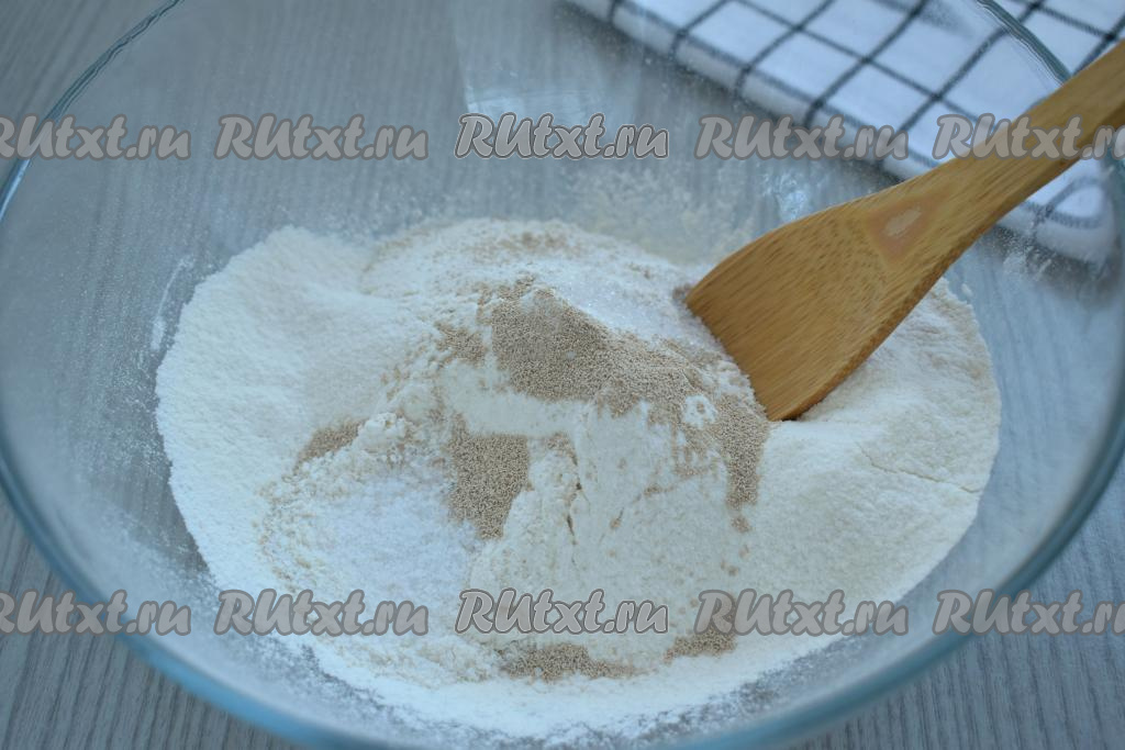 Прежде всего замесим дрожжевое тесто для пиццы, для этого просеиваем в объёмную миску 150 грамм муки, всыпаем сахар, соль и дрожжи, перемешиваем сухие ингредиенты, образуя в центре небольшое углубление.
