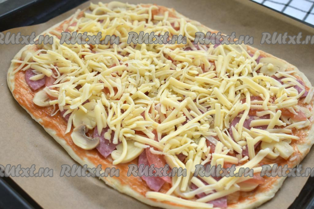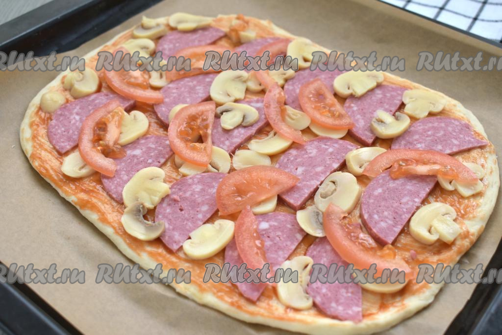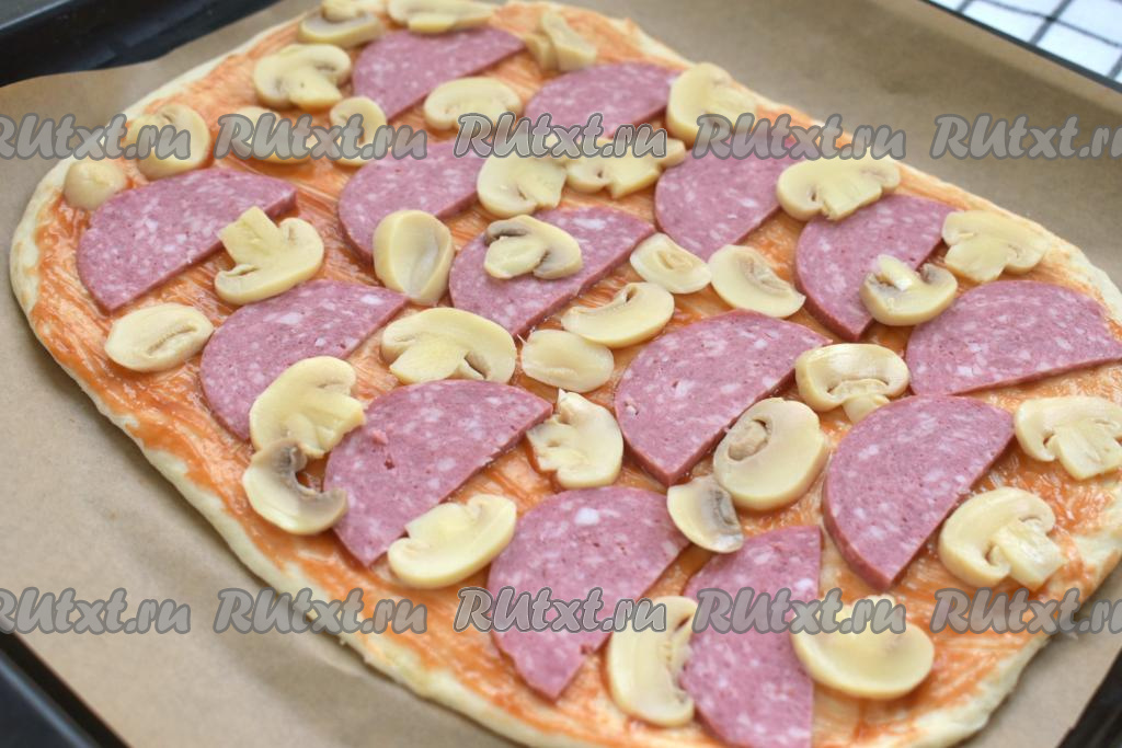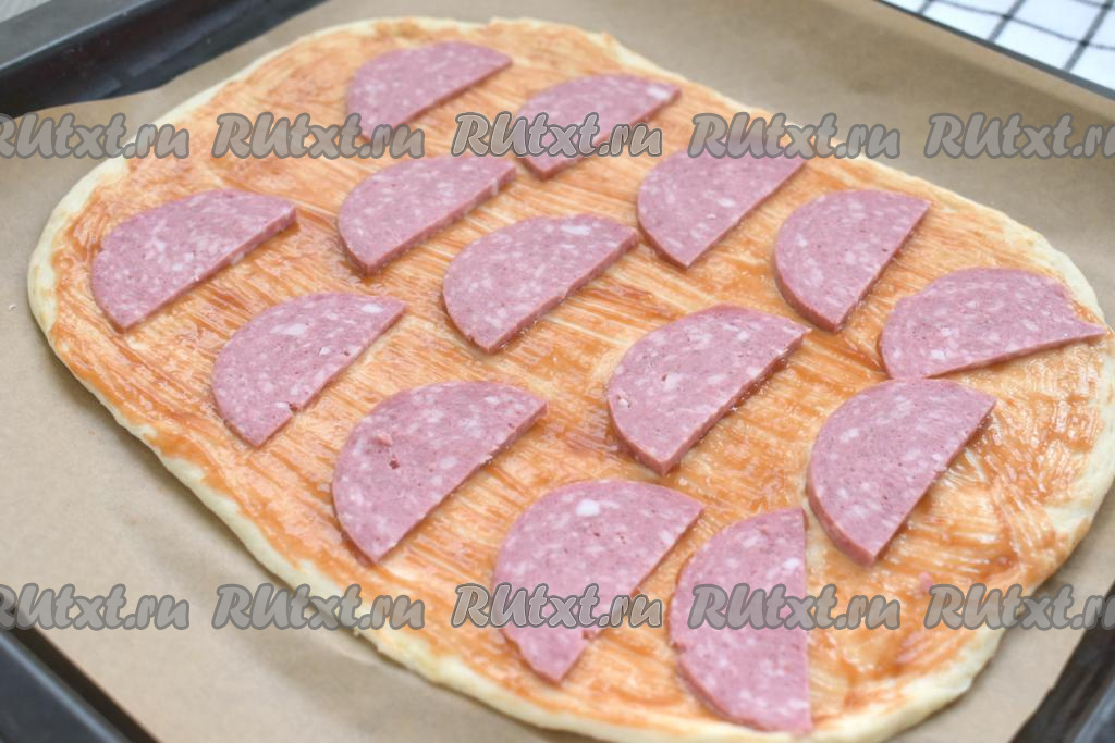 Основу для пиццы смазываем томатным соусом (или кетчупом). Нарезаем тонко колбасу (или сосиски), размещаем поверх смазанного теста.