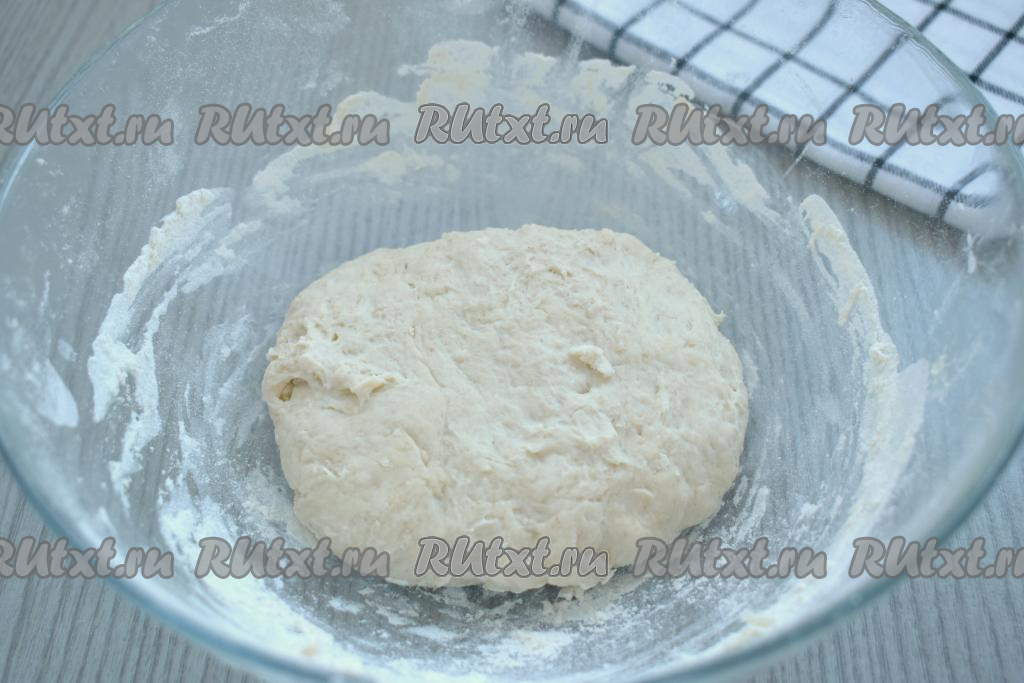Вначале перемешиваем тесто ложкой. А когда оно начнёт собираться в ком, хорошо вымешиваем его руками. В процессе вымешивания руками подсыпаем по мере необходимости понемногу оставшуюся муку, замешивая мягкое тесто, совсем немного липнущее к рукам. Миску с тестом для пиццы накрываем полотенцем (или затягиваем пищевой плёнкой) и на 1 час убираем в тёплое место.