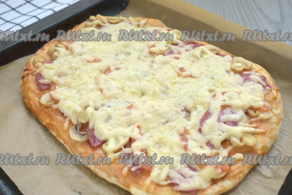 Через час тесто для пиццы хорошо поднимется, увеличившись в объёме раза в 2-3.