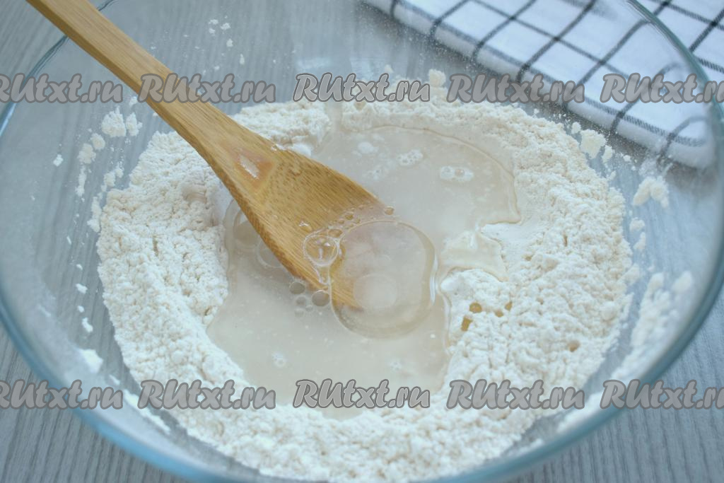В центр мучной смеси вливаем тёплую воду (температура воды 38-40 градусов) и растительное масло.
