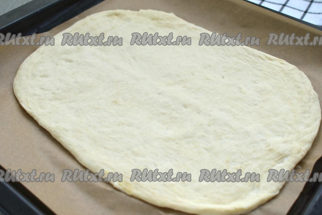 Противень застилаем пергаментом (или ковриком) для выпечки или просто смазываем противень маслом. Выкладываем на противень тесто и растягиваем, формируя основу для пиццы. У меня получилась прямоугольная заготовка размером 26 сантиметров на 20 сантиметров.