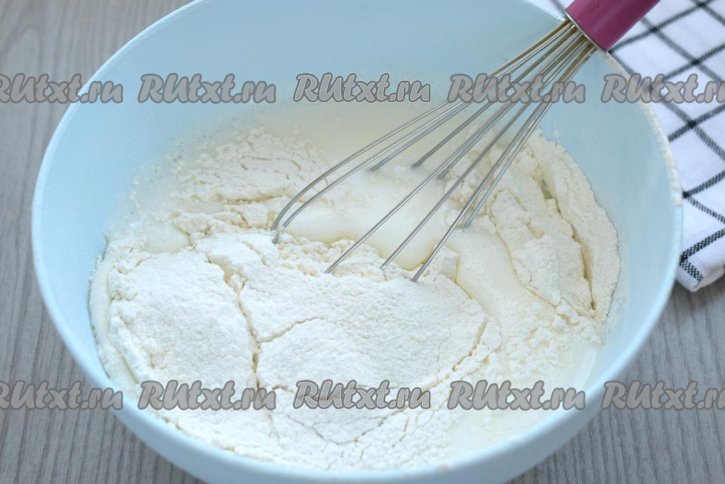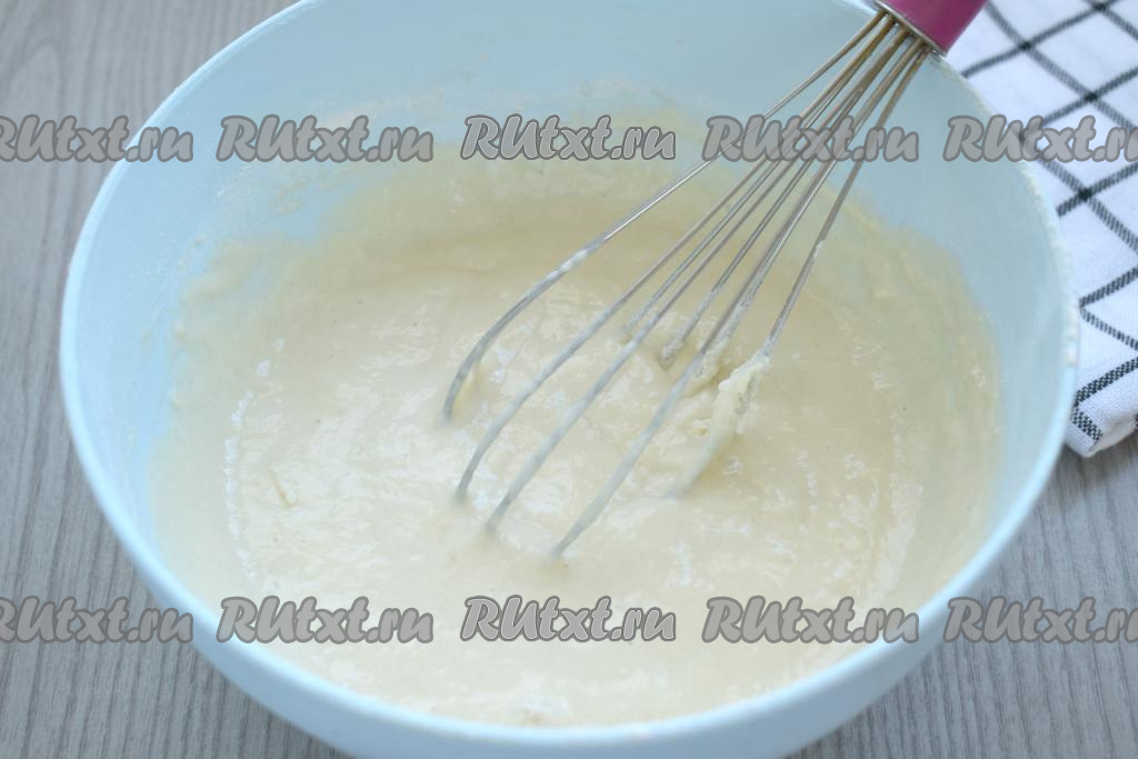 В получившуюся смесь всыпаем для аромата ванилин, начинаем частями добавлять просеянную муку, каждый раз очень хорошо перемешивая тесто для оладий венчиком.