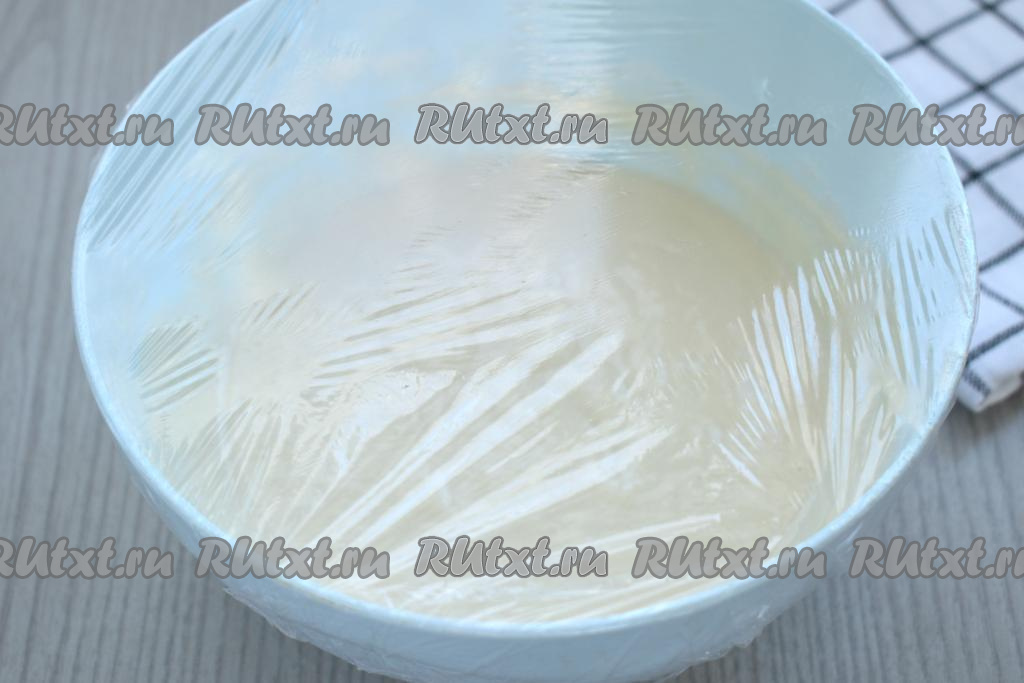 Миску с тестом затягиваем пищевой плёнкой (или накрываем крышкой) и на 30 минут оставляем при комнатной температуре.