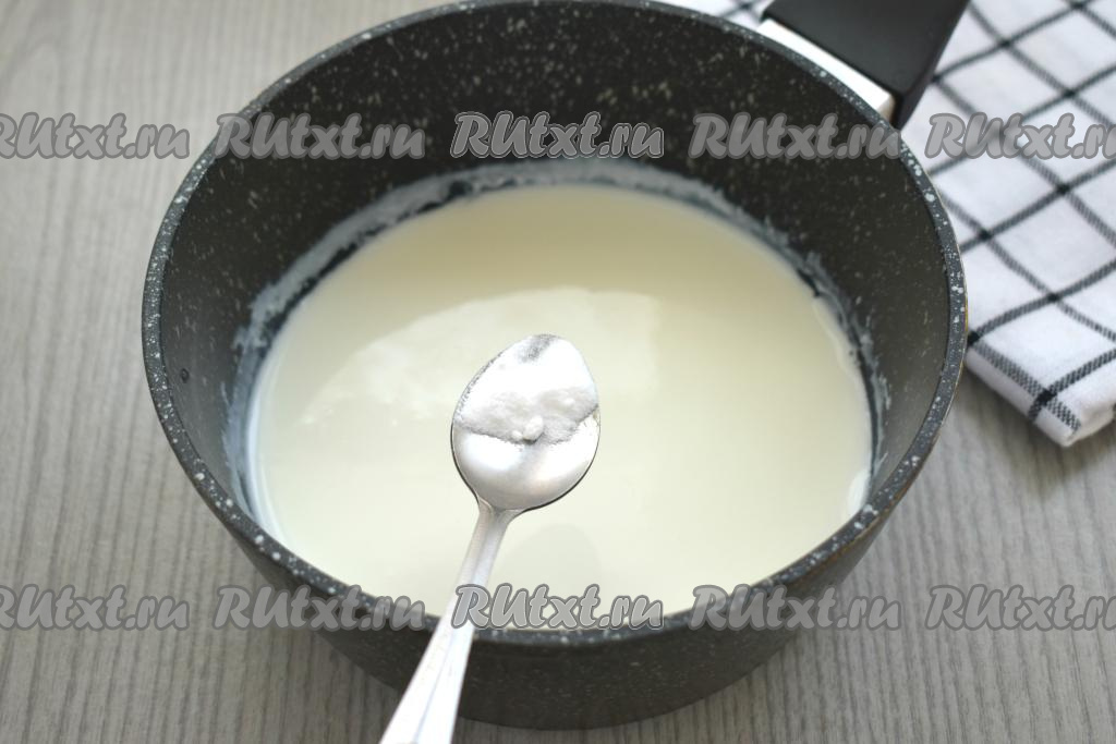 В тёплый кефир всыпаем соду, перемешиваем, оставляем минут на 5, чтобы сода полностью погасилась в кислой среде. Поверхность кефира в процессе гашения соды покроется пузырьками.