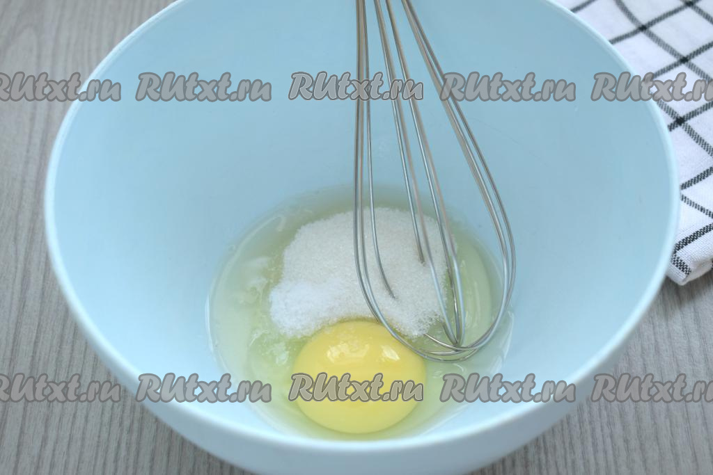 Пока сода гасится в кефире, в достаточно объёмную ёмкость разбиваем яйцо, всыпаем к нему сахар и соль, взбиваем венчиком 2-3 минуты.