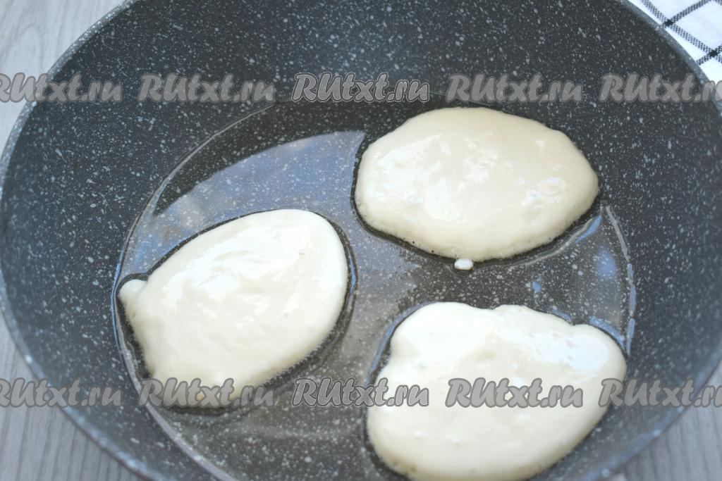 Через 30 минут приступаем к жарке оладий. Наливаем в сковороду растительное масло, хорошо разогреваем его. Затем выкладываем по 1-1,5 столовых ложки теста в форме круглых оладий. Жарим на среднем огне до подрумянивания с двух сторон (примерно по 2 минуты с каждой стороны).