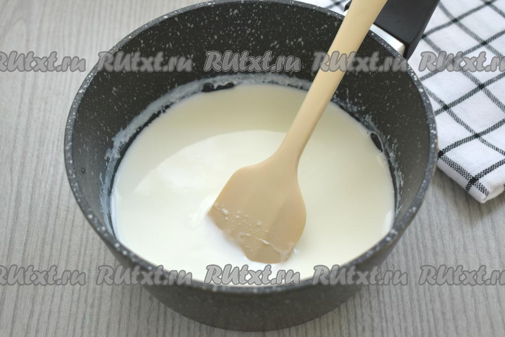 Кефир вливаем в ковшик и, постоянно помешивая, подогреваем его на среднем огне до 30 градусов. Снимаем с огня.