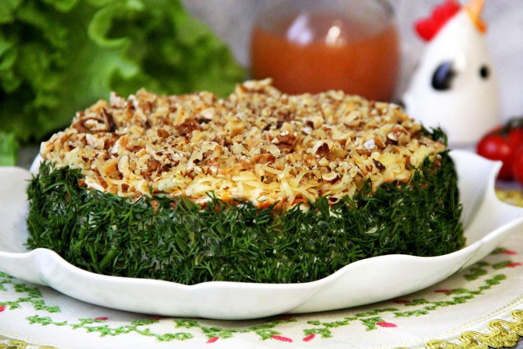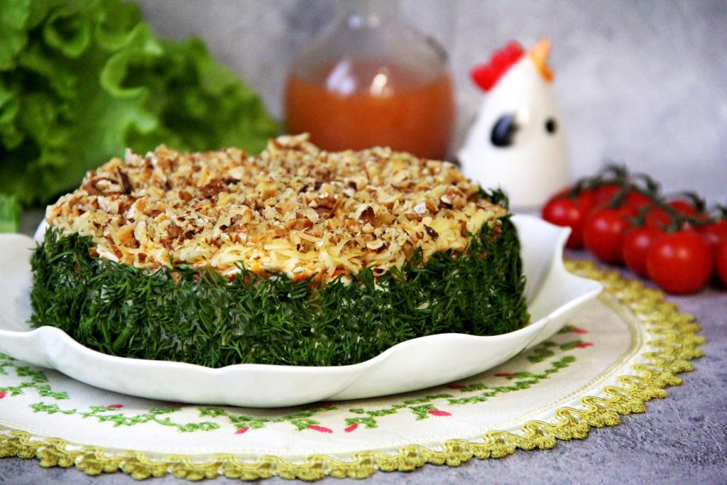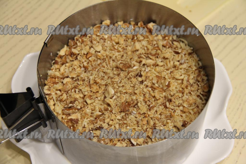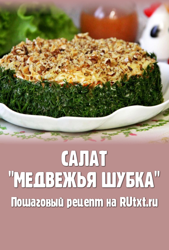 Орехи порубить ножом, но не мелко, и выложить поверх сыра. В таком виде поставить салат "Медвежья шубка" в холодильник на 2-3 часа.