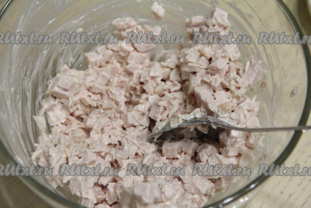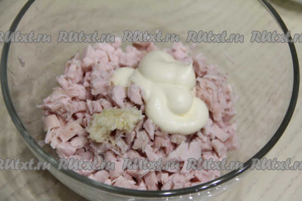 Копчёное куриное мясо нарезать на мелкие кубики, выложить в миску, добавить чеснок, пропущенный через пресс, и 2 столовых ложки майонеза.