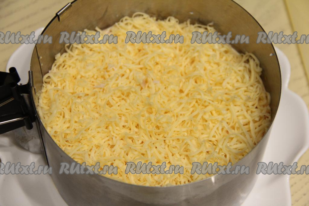 Далее выложить сыр, натёртый на мелкой тёрке.