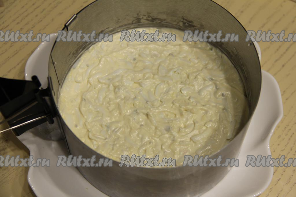 Смазать яичный слой майонезом, разровнять.