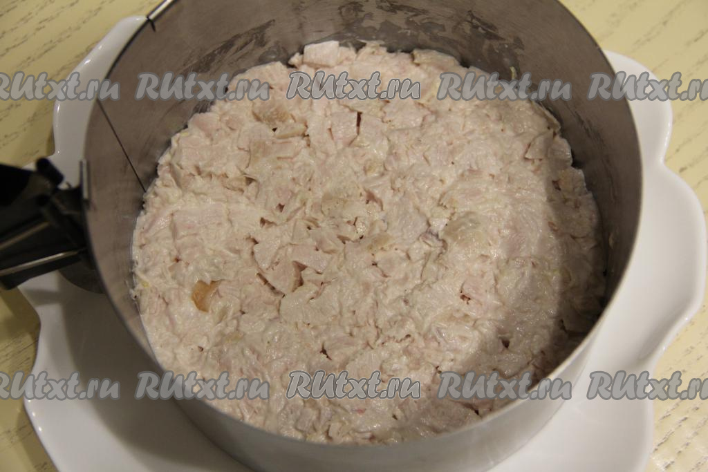 Для формирования салата я использовала кулинарное кольцо диаметром 18 сантиметров. Поставить кольцо на плоскую тарелку, выложить массу из копчёной курицы и равномерно распределить, слегка утрамбовать.