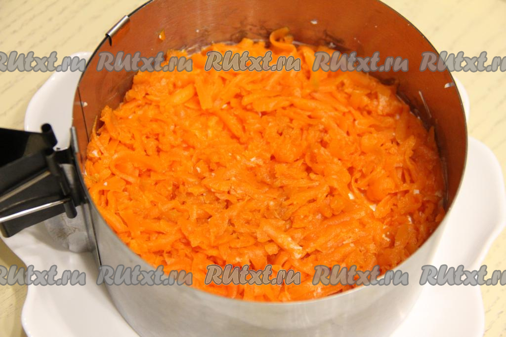 Следующим слоем выложить варёную морковь, натёртую на крупной тёрке.
