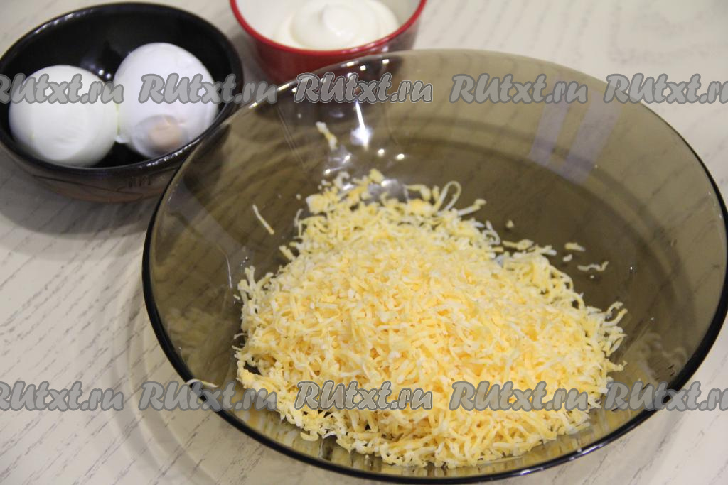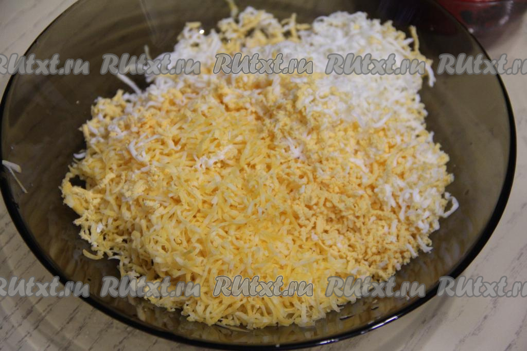 Затем в эту же миску натереть варёные яйца на мелкой тёрке.