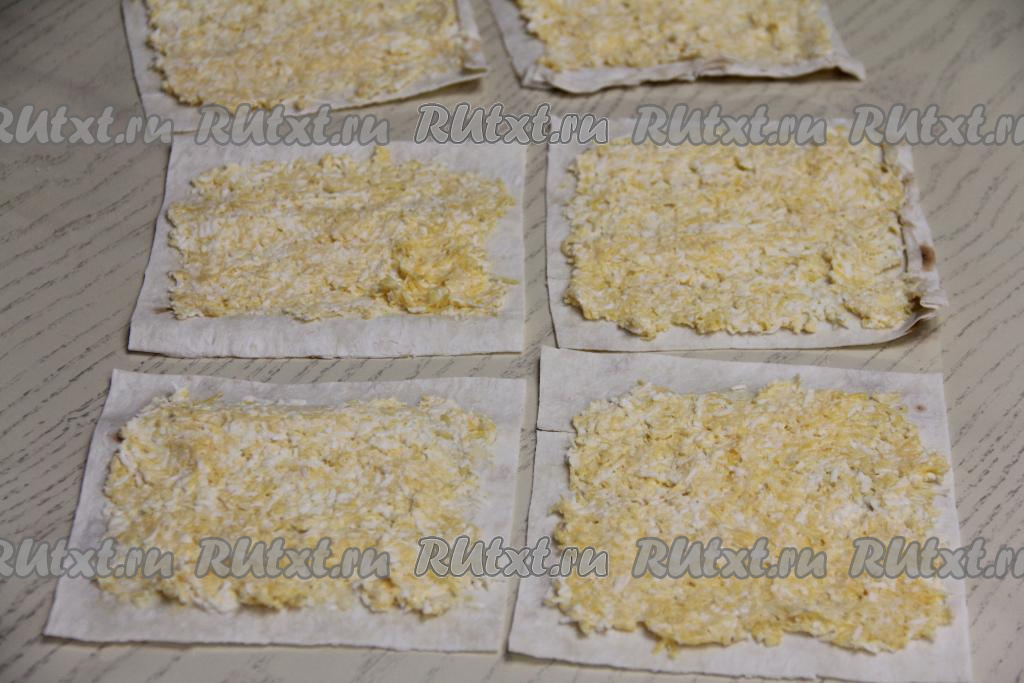 Выложить на каждый квадратик лаваша примерно 1,5 столовых ложки яично-сырной начинки и распределить равномерным слоем, отступив от краёв ориентировочно по 1 сантиметру.