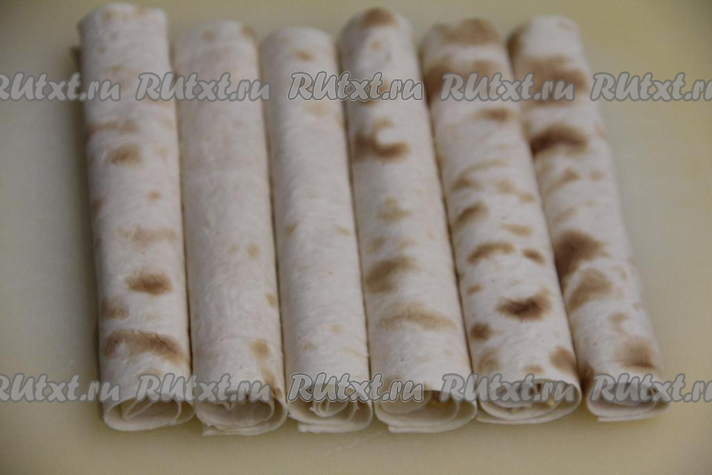 Свернуть каждый квадрат из лаваша с яично-сырной начинкой в плотную трубочку.