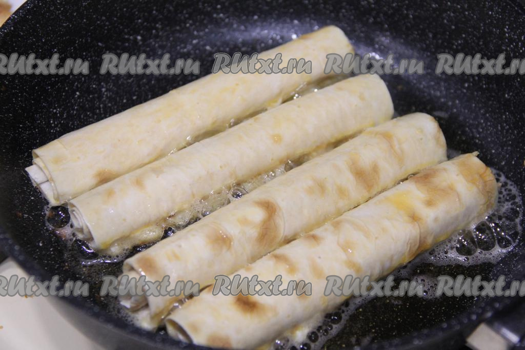 Жарить трубочки с двух сторон до золотистого цвета (примерно по 2-3 минуты с каждой стороны) на среднем огне. Постепенно покрыть яйцом и обжарить все трубочки из лаваша.