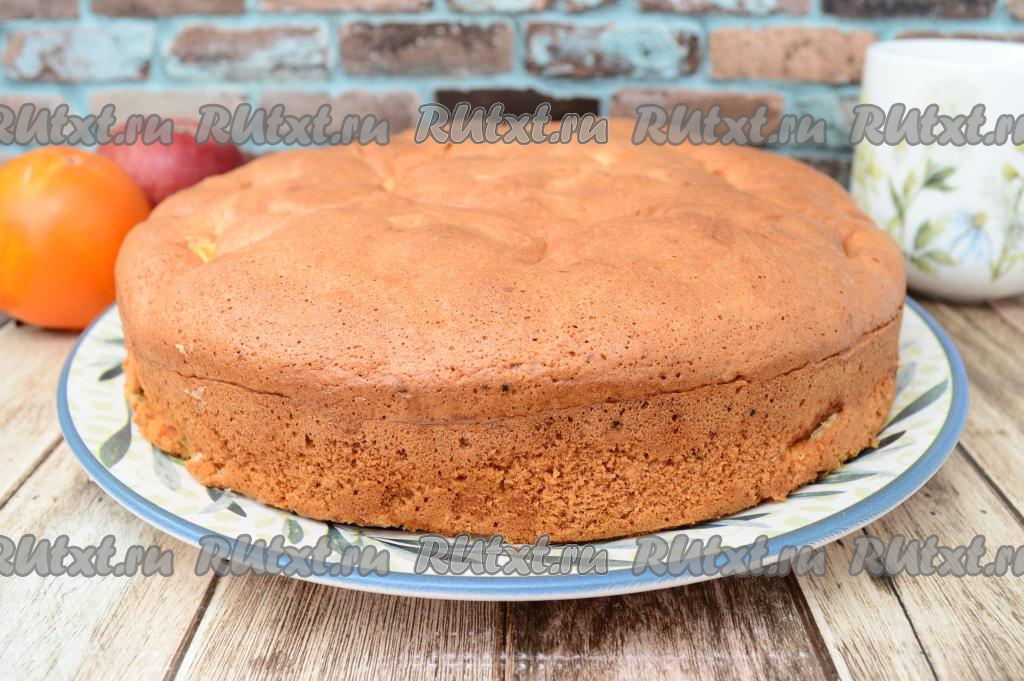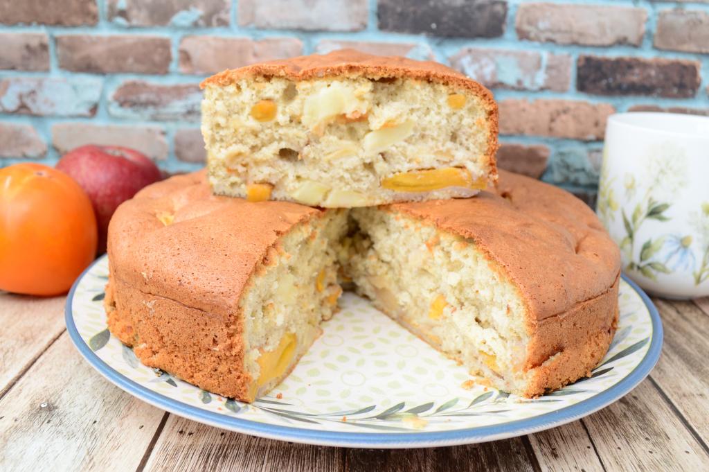 А вот как шарлотка с хурмой и яблоками выглядит в разрезе. Воздушное, нежное бисквитное тесто в сочетании с яркой, сочная начинка из хурмы и яблок делают этот пирог замечательным дополнением к семейному чаепитию!