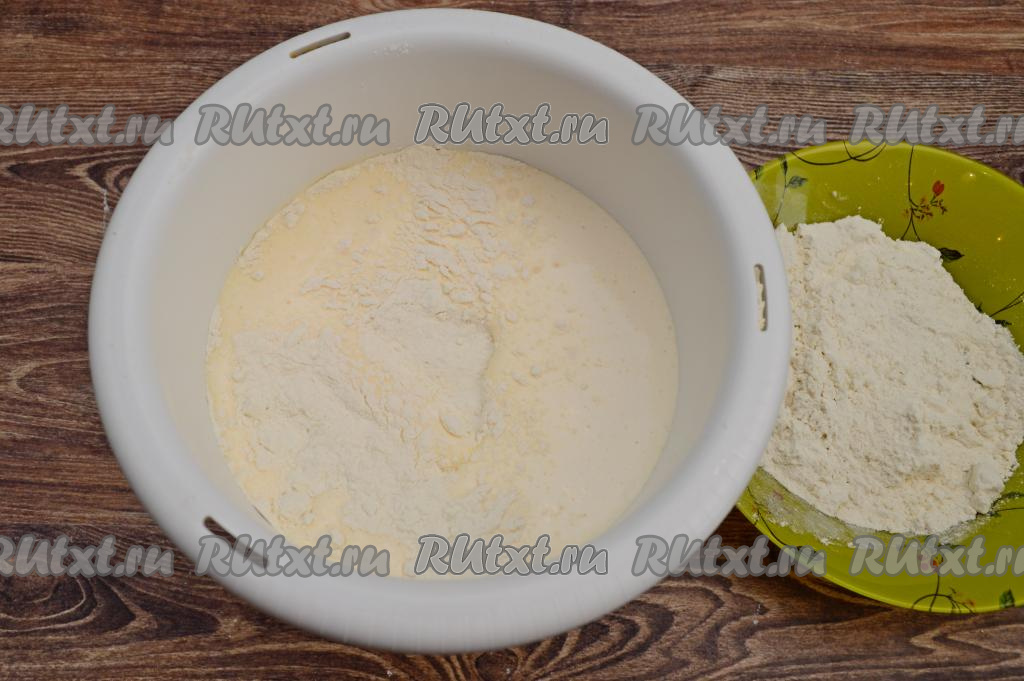 В чашу со взбитыми яйцами всыпать 100 грамм просеянной муки и весь разрыхлитель, перемешать тесто лопаткой до однородности.