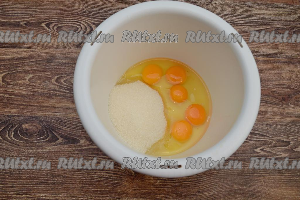 В чашу, в которой будет удобно взбивать миксером, вбить сырые яйца, всыпать сахар.