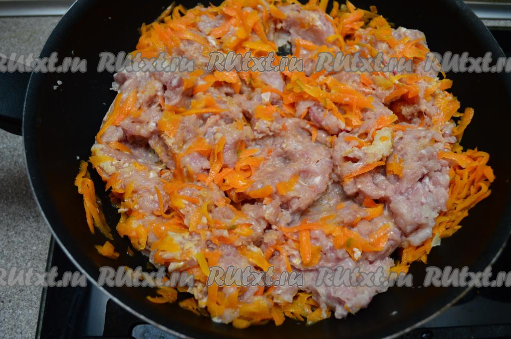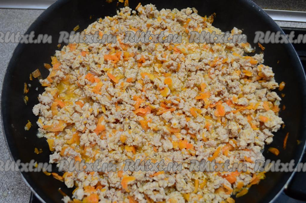 После того как морковка станет мягкой, выложить в сковороду куриный фарш, разровнять. Обжаривать фарш, регулярно перемешивая и разбивая мясные комочки, до изменения цвета мяса с розового на сероватый.