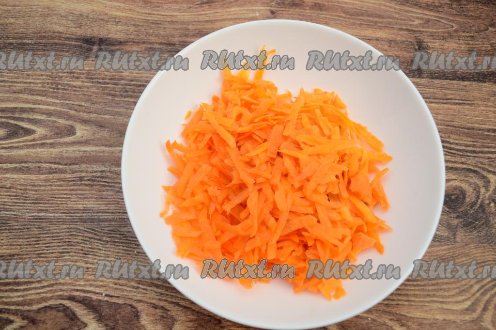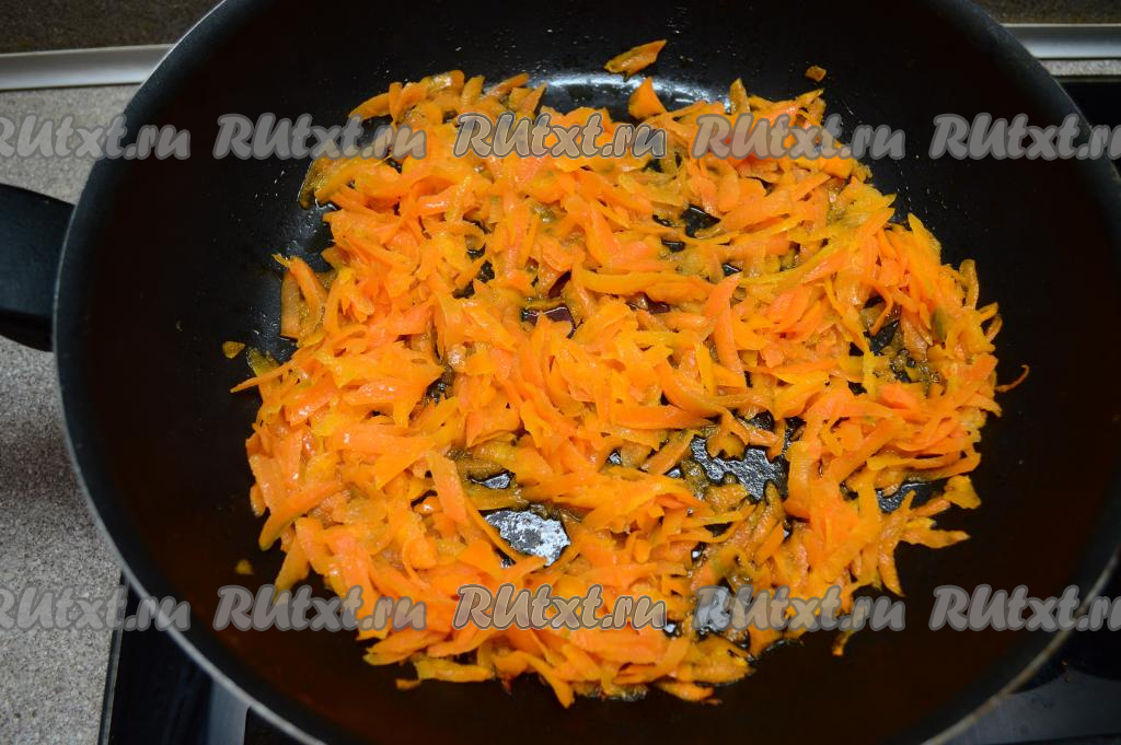 Прогреть в сковороде растительное масло, выложить натёртую морковку и обжарить её на среднем огне, периодически перемешивая, до мягкости (я обжаривала 7 минут).