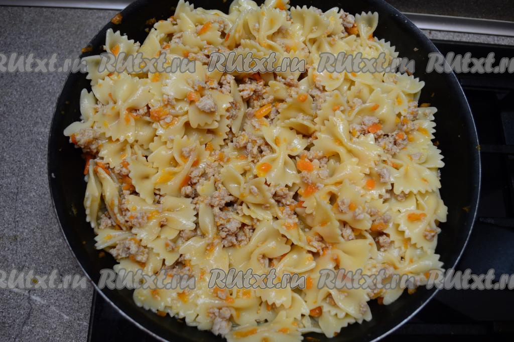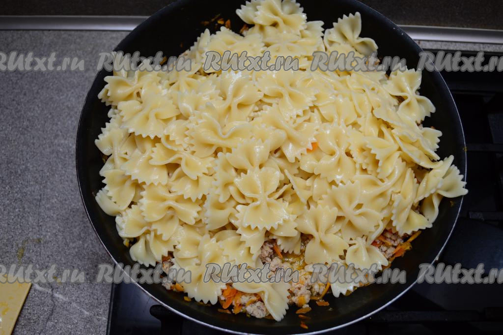 После того как куриный фарш протушится под крышкой 10-12 минут, выложить в сковороду макароны, перемешать.