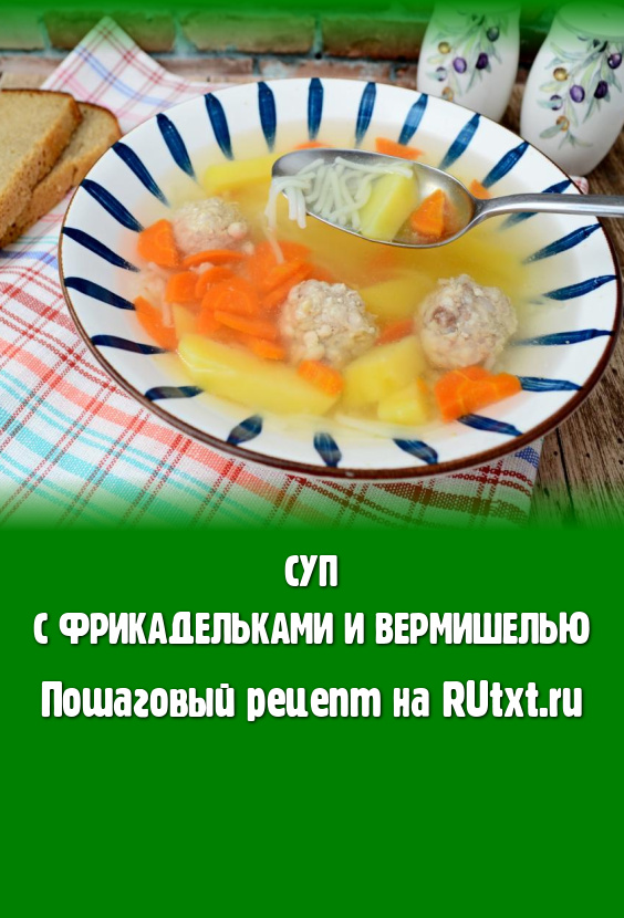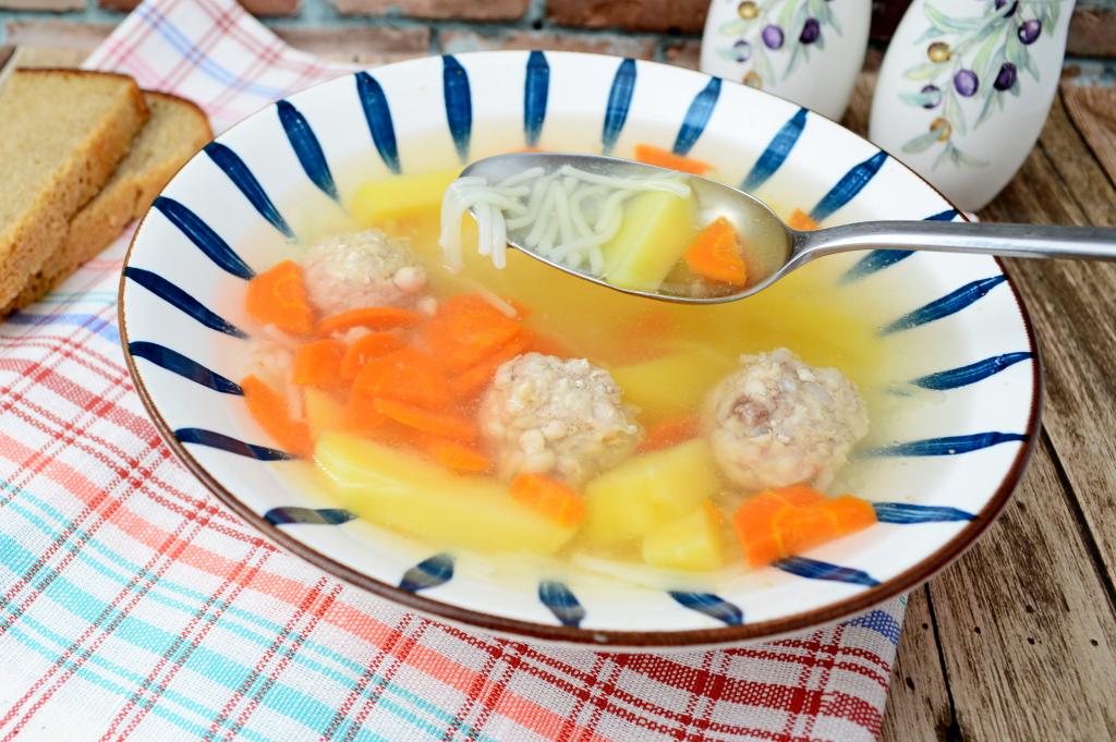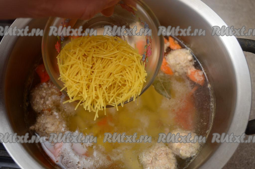 После того как овощи проварятся в супе 15-20 минут, они станут достаточно мягкими (будут легко прокалываться вилкой). Дать супу с фрикадельками закипеть, всыпать вермишель, перемешать, убавить огонь, варить 3-5 минут и наше блюдо готово.