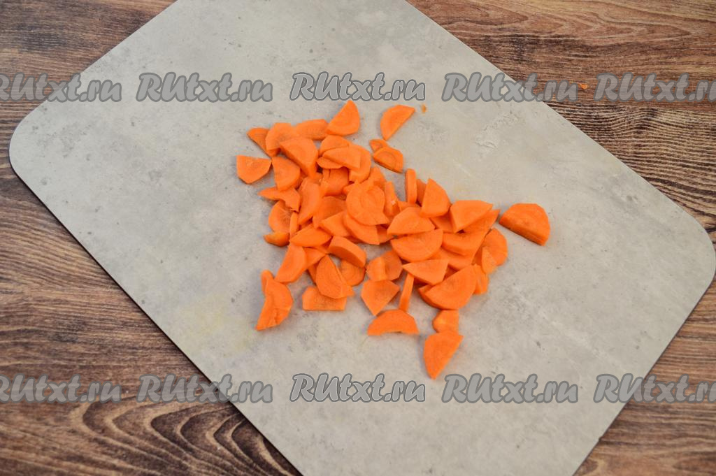 Пока вода с фрикадельками закипает, очистить и нарезать на тонкие полукружочки (или на брусочки) морковку.